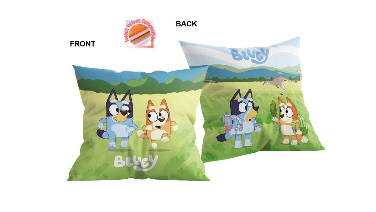 Βελούδινο διακοσμητικό μαξιλάρι διαστάσεων 38X38cm, με σχέδιο ψηφιακής εκτύπωσης και στις δύο πλευρές που απεικονίζει τις αγαπημένες αδερφές Bluey και Bingo της σειράς των Ludo & BBC Studios, Bluey. Κατασκευασμένο από 100% Velboa (Faux Fur) ύφασμα, κάτι που το καθιστά πολύ απαλό και μαλακό και προσδίδει βελούδινη υφή. Συσκευασία Polybag.